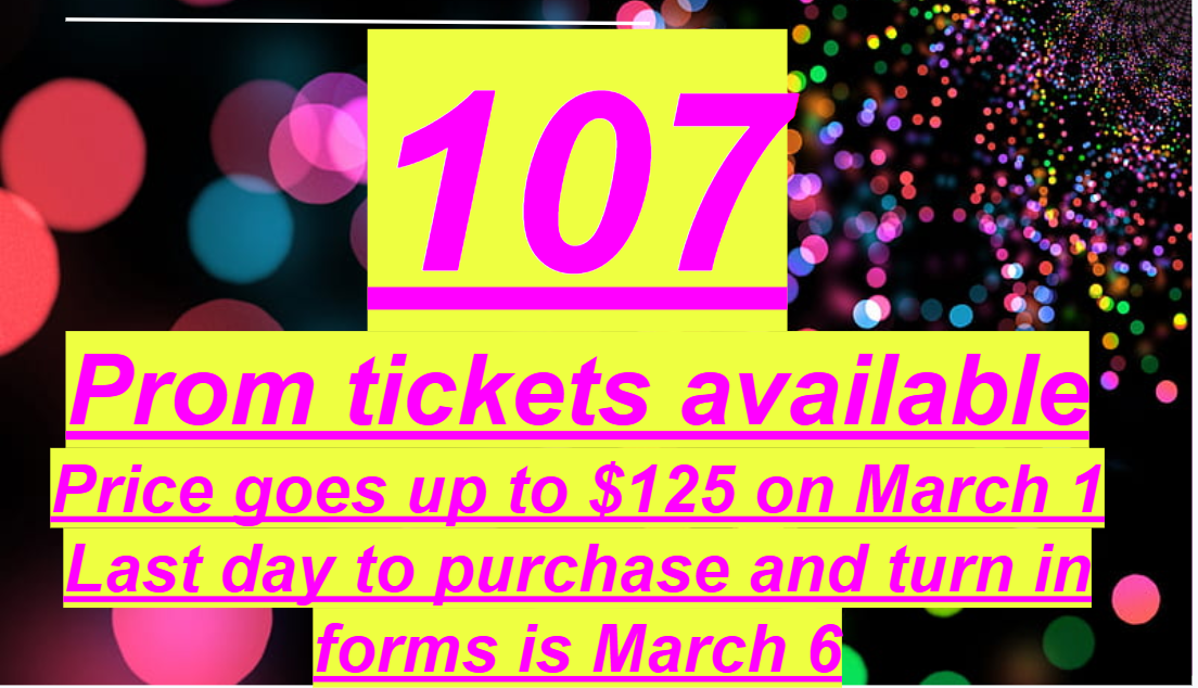 This week is the last week to purchase prom tickets for $100. Beginning March 1, prices will go up to $125. We currently have 107 tickets left. The last day to purchase tickets and turn in forms is...