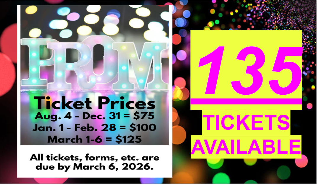 Prom tickets are $100 through Feb. 28. Prices will go up to $125 on March 1. As of today, there are 135 tickets left. See Ms. Brewer to pay cash, check, or card, or pay on GoFan.